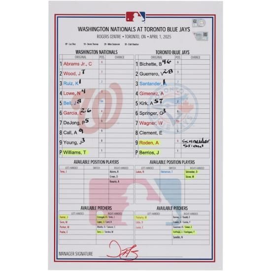 ワシントン・ナショナルズ ファナティクス オーセンティック 実際の試合で使用された ラインアップ カード vs. トロント・ブルージェイズ オン April 1, 2025は、メジャーリーグ公認のMLBグッズです。