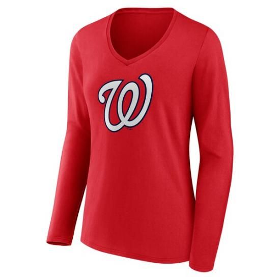 ワシントン・ナショナルズ レディース オフィシャル ロゴ ロングスリーブ Vネック Tシャツ - レッドは、メジャーリーグ公認のMLBグッズです。