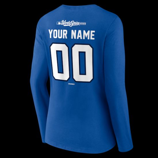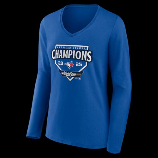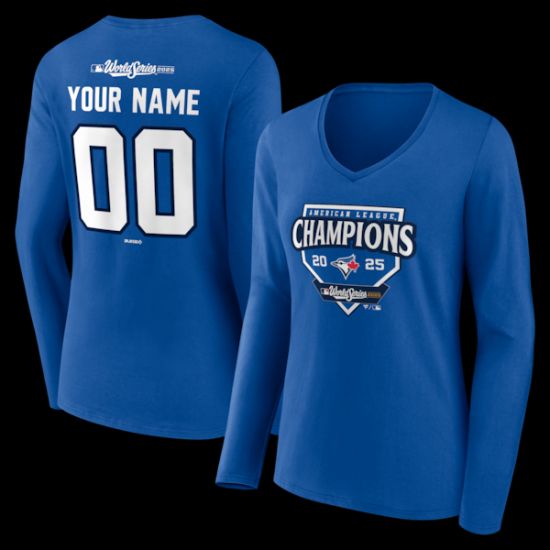 トロント・ブルージェイズ レディース 2025 アメリカn リーグ チャンピオン カスタム ネーム&ナンバー ロングスリーブ Vネック Tシャツ - ロイヤルは、メジャーリーグ公認のMLBグッズです。