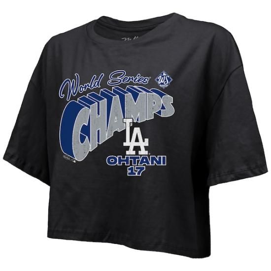 大谷翔平 ロサンゼルス・ドジャース マジェスティック スレーズ レディース 2025 ワールド シリーズ チャンピオン ネーム&ナンバー ボックスy 短く切った Tシャツ - ブラックは、メジャーリーグ公認のMLBグッズです。