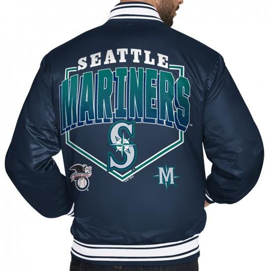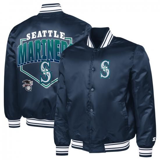 シアトル・マリナーズ スターター ホーム プレート プリント グラフィック サテン フル-スナップ ヴィーシティ ジャケット - ネイビーは、メジャーリーグ公認のMLBグッズです。